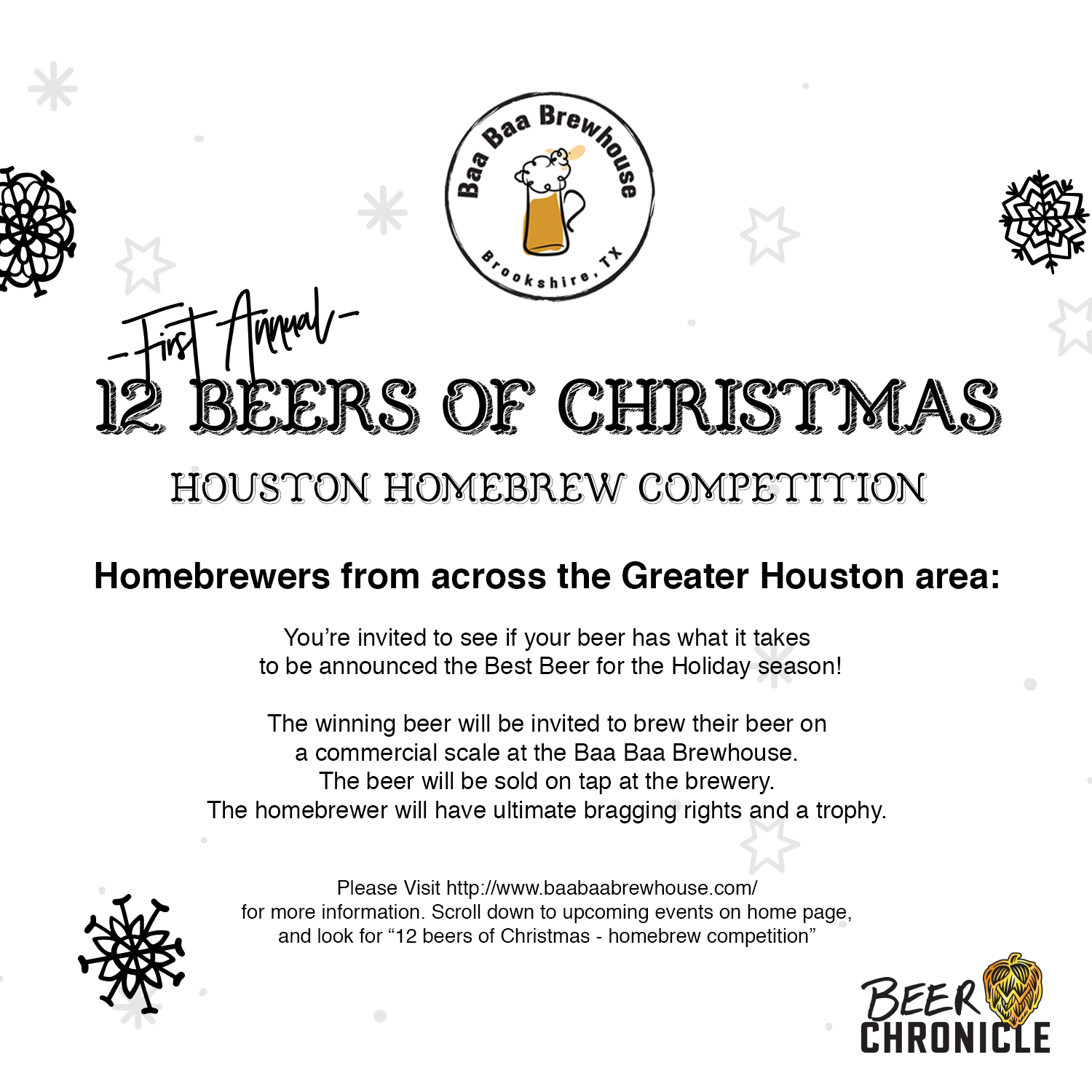 Our friends Marcus and Kinga over at Baa Baa Brewhouse are hosting the 12 Beers of Christmas, a Houston Homebrew Competition. The competition will happen in 2 stages beginning in December, and the winner will be invited to brew their beer on a commercial scale at Baa Baa Brewhouse along with bragging rights, a trophy, and the opportunity to share their beer with thirsty Houstonians (and Brookshire-ans?) More info below, along with links to Baa Baa Brewhouse’s site and official entry terms.