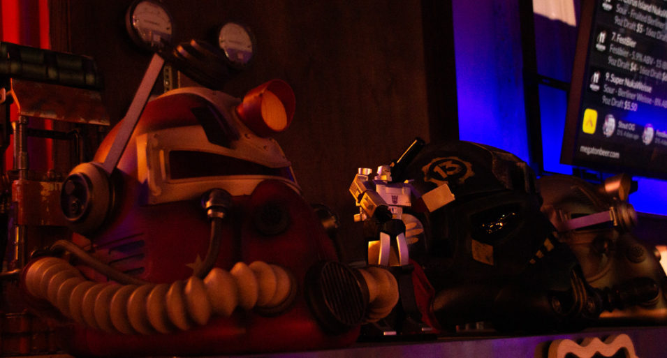 We’re then greeted by the Master Brewer, Jered Montgomery, who offers up a couple of pours of the CitraVolt NEIPA from the wall of heavy pipe taps. We lean up on the massive concrete slab bar top while taking in the rest of the view. The space is adorned with a museum-quality curated collection of Star Wars helmets, future tech space blasters (non-working models presumably) and a medley of action figures, and iconic collectables from video games and a ‘certain’ post nuclear RPG.