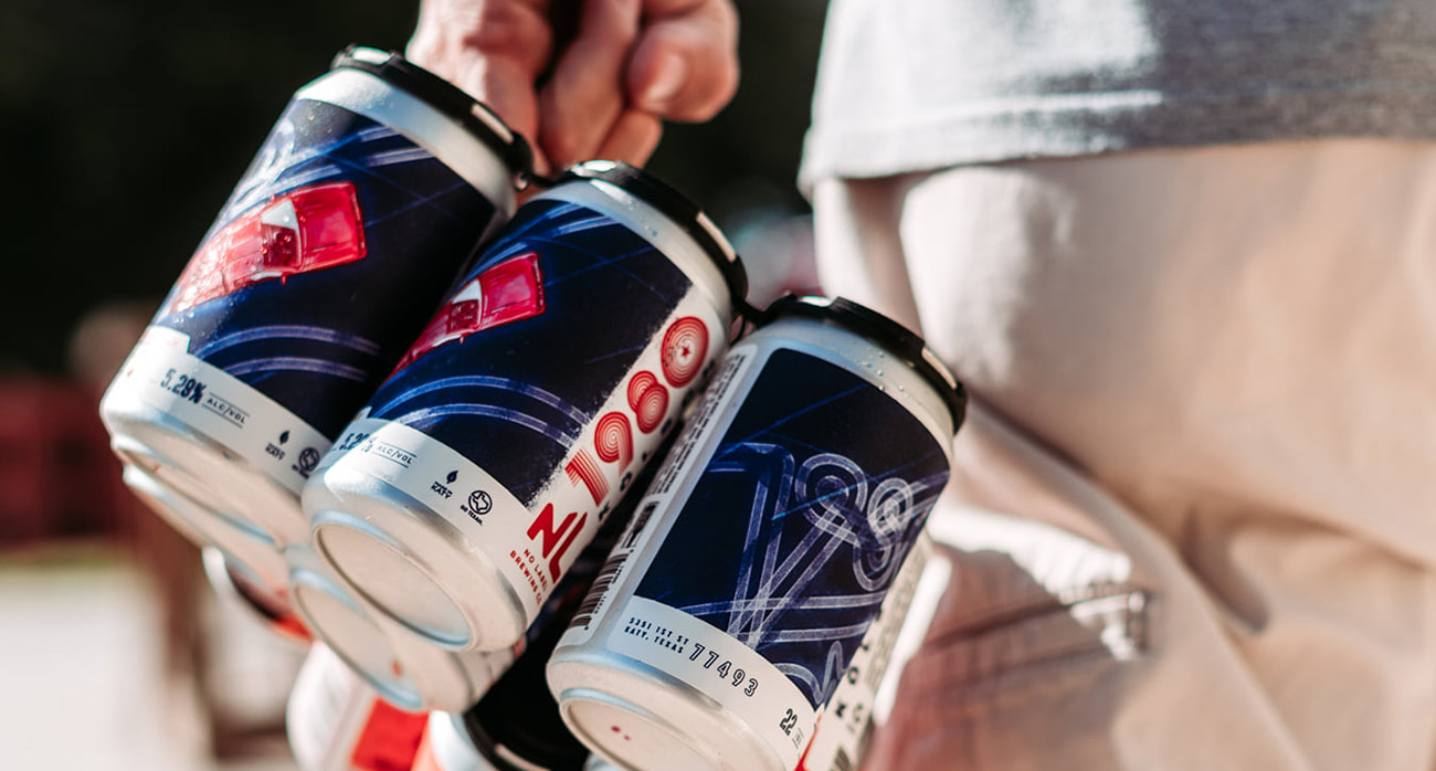 This craft beer illustration was tough. Americana from the 1980’s led to illustrations of drive in movies, but it wasn’t cutting it. Tom stepped in and suggested Back to the Future, the Delorean, something a little less kitschy. Bingo. Nailed it, Tom. No Label’s new label artwork usually features a full-width art panel with the name of the beer on the side, but the old 1980 can had it smack dab in the middle. We had to figure out a way to retain that for visibility on the shelves, and bingo the tire marks came to life. Every No Label label project comes along with an Instagram sticker GIF to be shared on stories as well as a few other deliverables