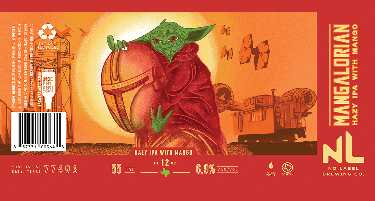 Come up with a parody beer label that pays homage to Katy and the Mandalorian while somehow making mangos fit into the visual.