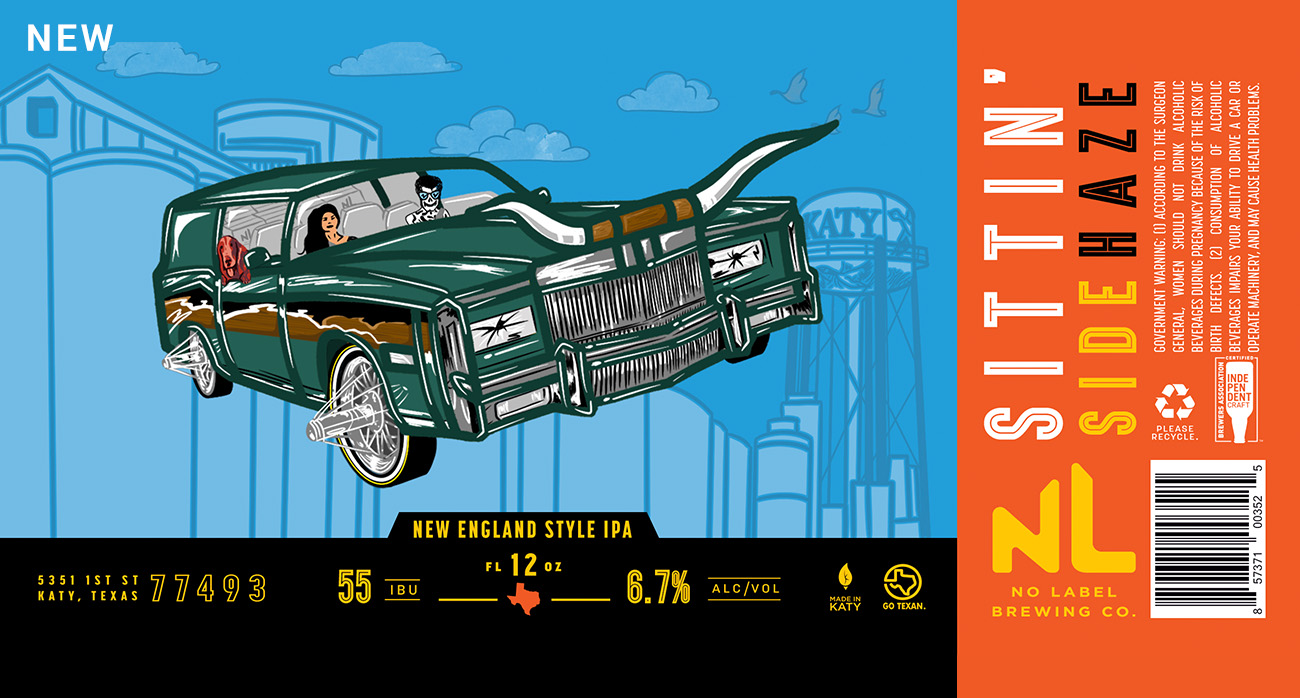 Redesign the original Sittin Sidehaze label while retaining the same color scheme, but adding a bit more authenticity. Craft beer label design has to be authentic. Sittin Sidehaze is meant to be a play on words from Paul Wall’s 2005 smash hit “Sittin Sidewayz” featuring Big Pokey. It was intended to mesh Katy’s suburban lifestyle with Houston SLAB culture, but despite their best efforts it fell short. The original car was a ’64 Impala on Daytons. For all my hip hop heads, y’all know that’s more West Coast than palm trees and IPA origins. This artwork needed to be a big body 78′ Cadillac El Dog clankin’ on 84’s with the wild obnoxious bull horns on the hood. Now THAT’S SLAB culture.