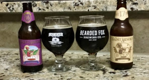 Beer-Chronicle-Houston-Craft-Beer-Review-Saint-Arnold-Bishops-Barrel-17-vs-Divine-Reserve-16-Side-By-Side-Full-Glasses-Next-To-Bottles