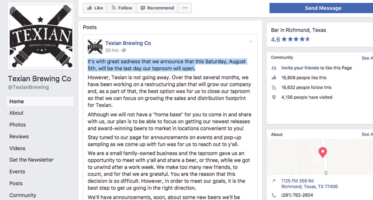 Our very own Chris messaged Josh to ask him about their latest announcement that Texian Brewing closing their taproom.